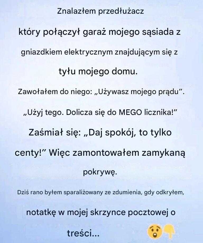 Pomarańczowy przedłużacz biegł przez mój trawnik niczym neonowa ścieżka, prosto z garażu sąsiada do mojego gniazdka na tylnej ścianie domu. Zatrzymałem się, niepewny, co myśleć. Może to chwilowe, pomyślałem. Może podłączyli go i zapomnieli o nim. Ale po bliższym przyjrzeniu się stało się jasne, że to połączenie zostało wykonane celowo – nawet mnie o to nie pytając. Przez chwilę byłem bardziej zaskoczony niż zirytowany – nadal świetnie się dogadywaliśmy.